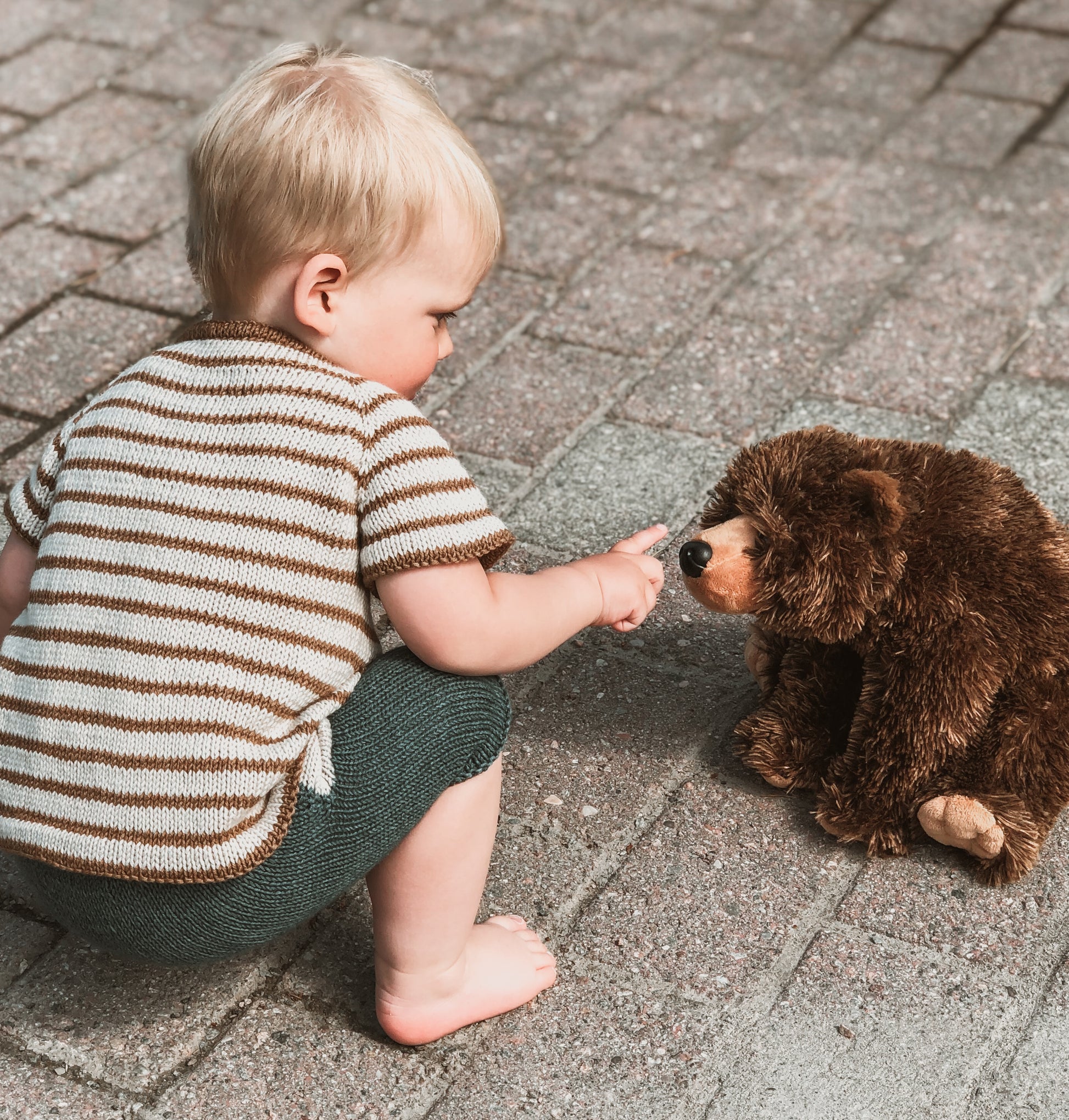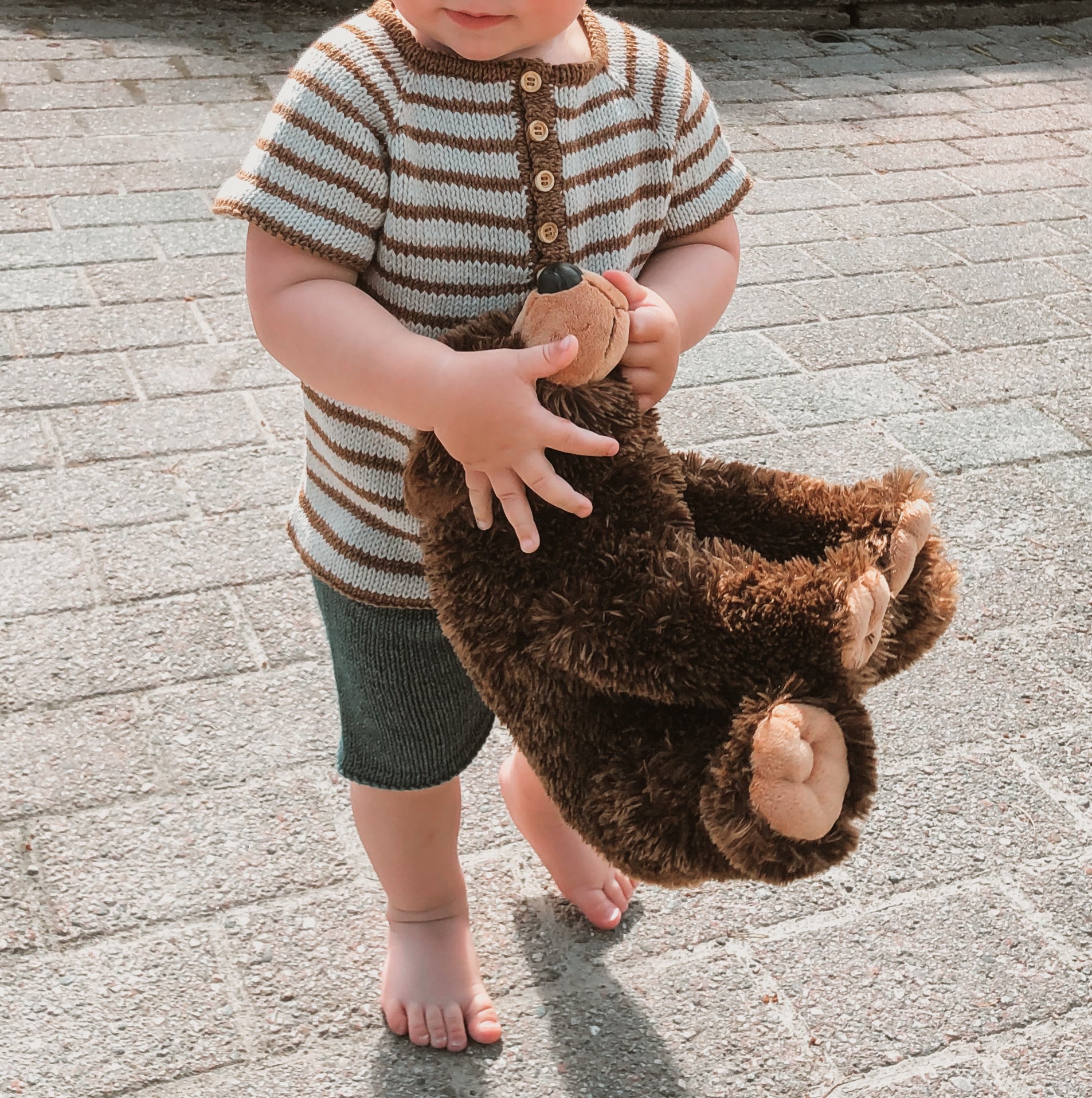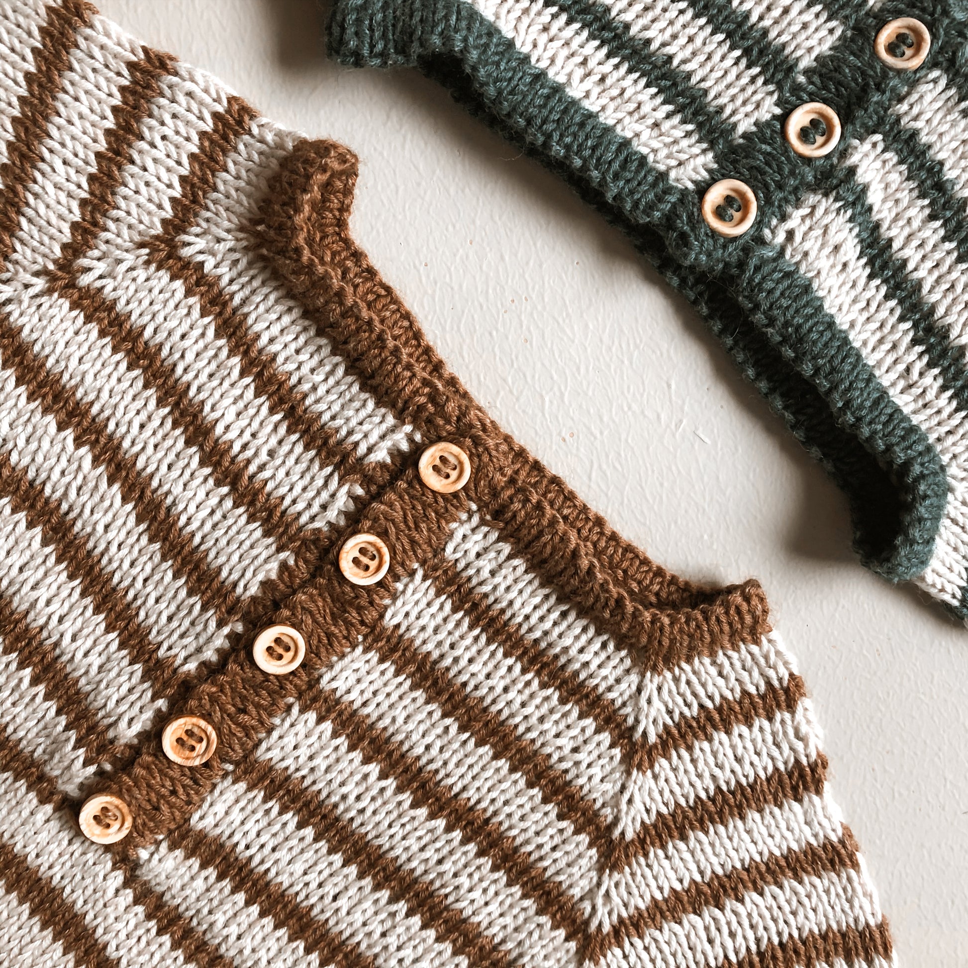 Anders‘ T-Shirt ist ein gestreiftes Großvaterhemd im Strumpfstich mit Knöpfen auf der Brust. Es wird von oben nach unten gestrickt. Die Passe wird in Hin- und Rückreihen auf Rundstricknadeln gestrickt, während Raglanzunahmen gemacht werden, dann in Runden auf Rundstricknadeln.