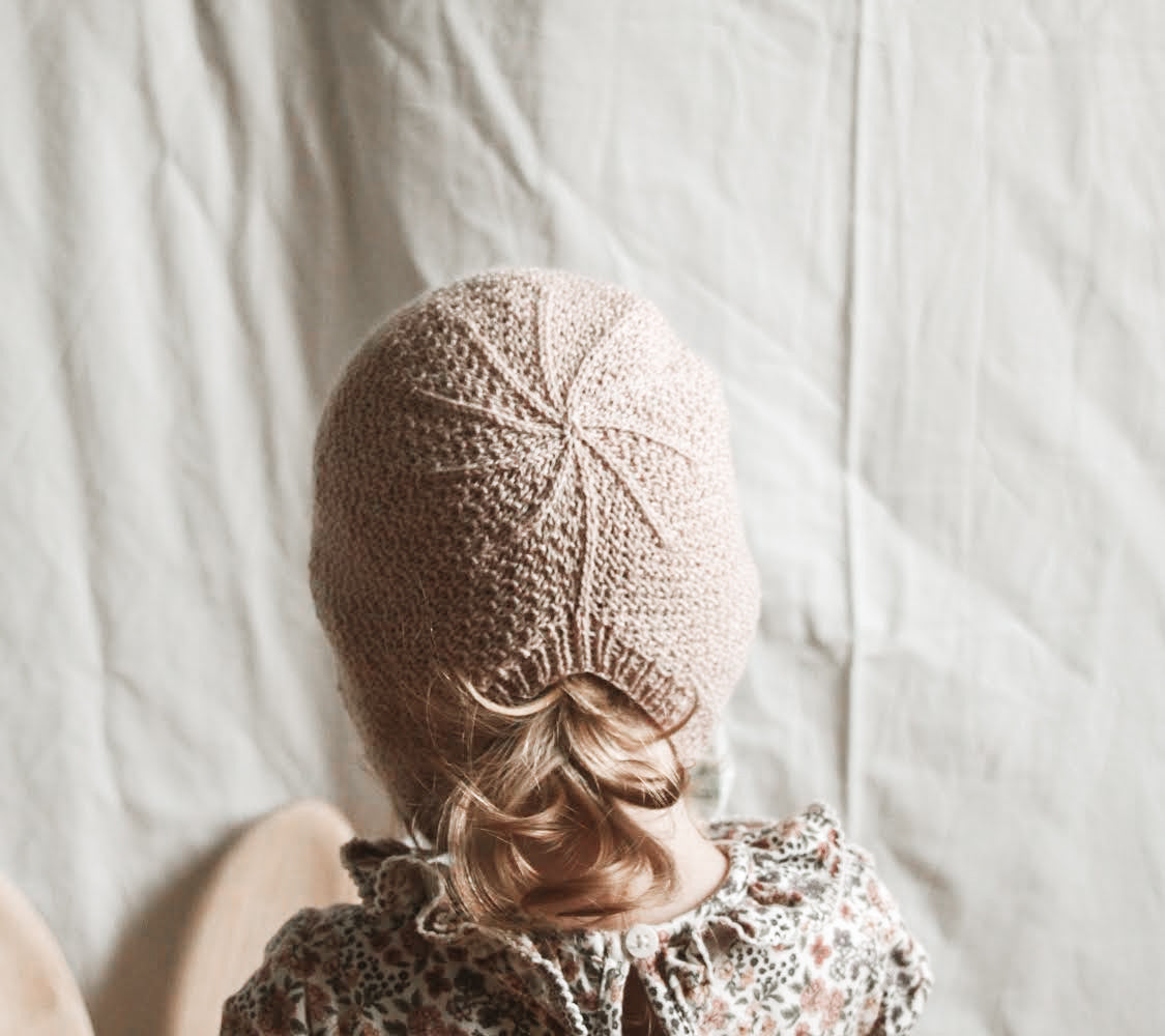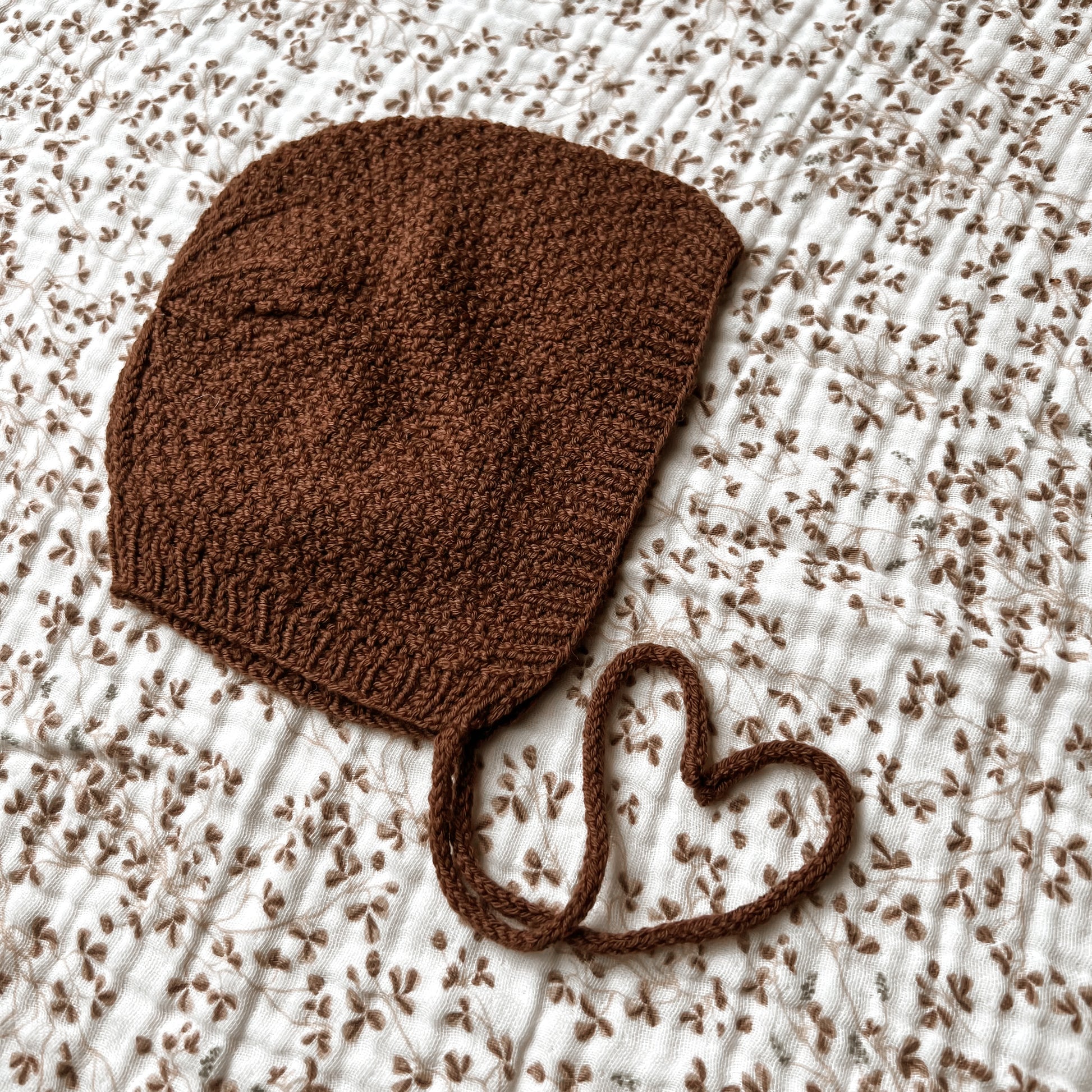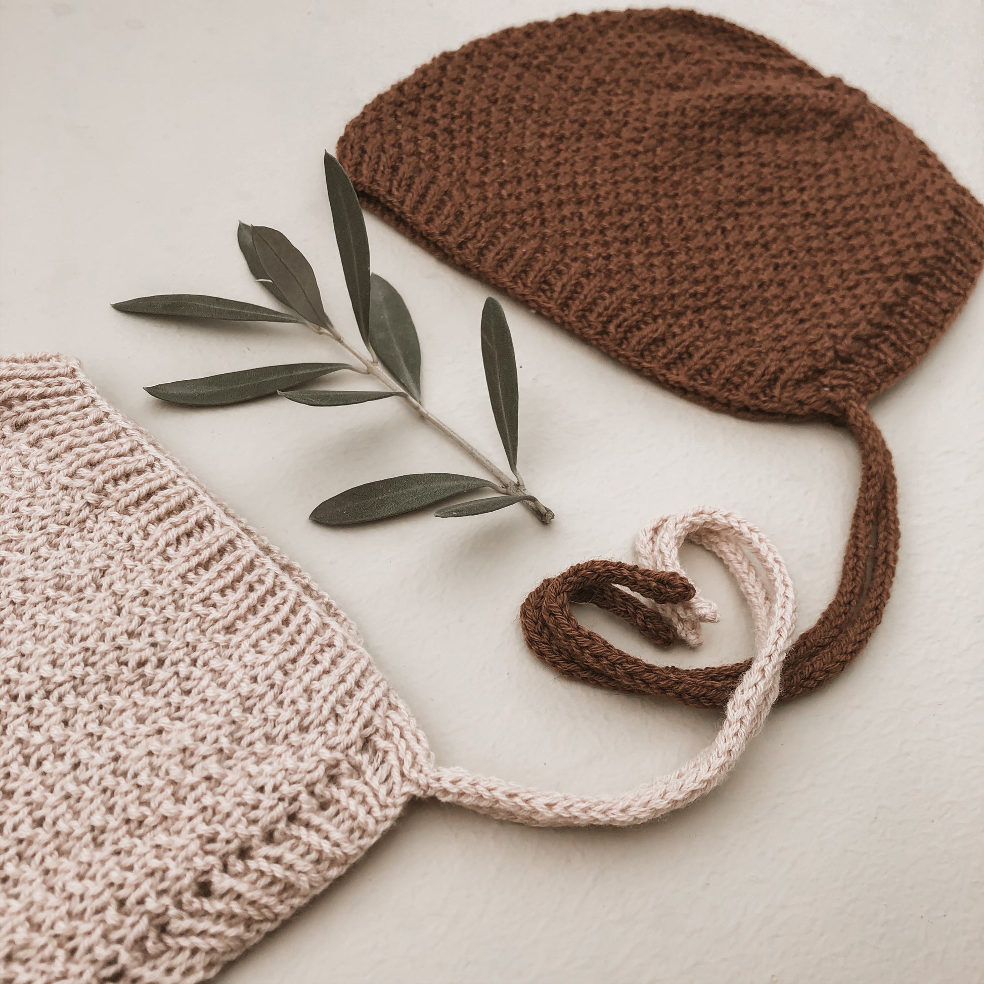 The Ailo bonnet is first knitted back and forth on circular needles, before the back of the head is knitted in the round with decreases. Finally, the neck edge is knitted, and an icord is used for tying.