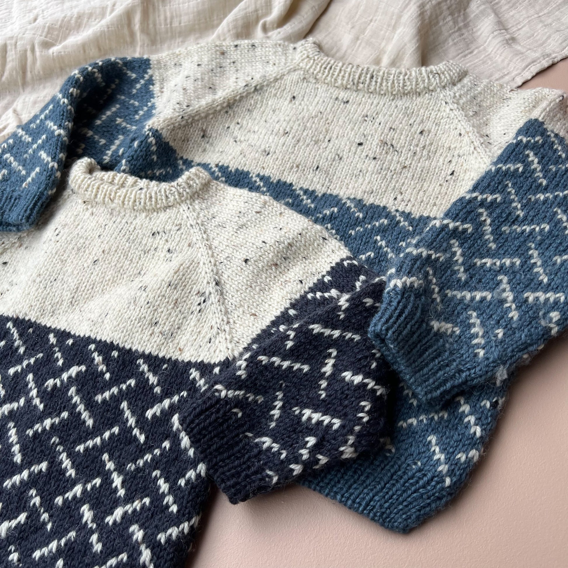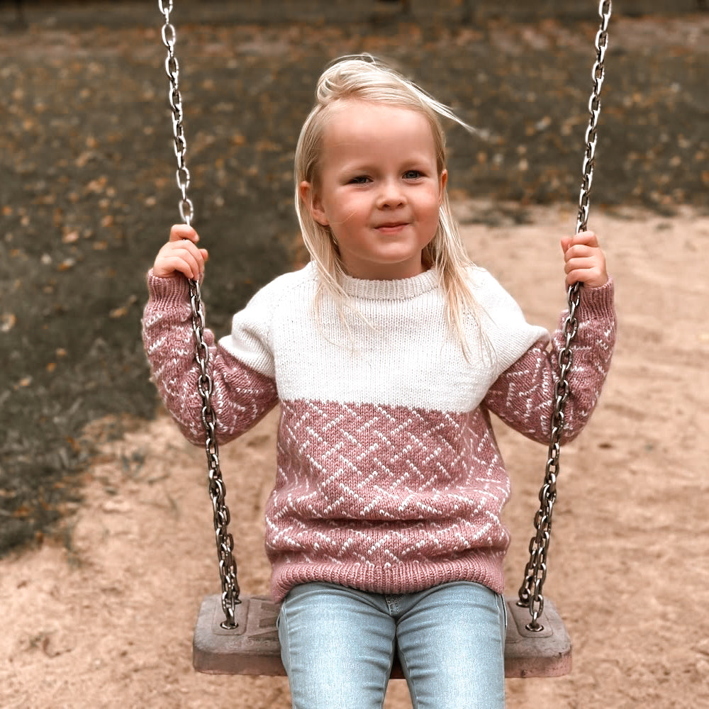 Hedda sweater junior is knitted from the top down, with raglan increase on the yoke. The yoke is knitted in one color, while the body and sleeves are knitted in two colors following the chart.