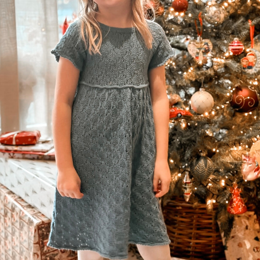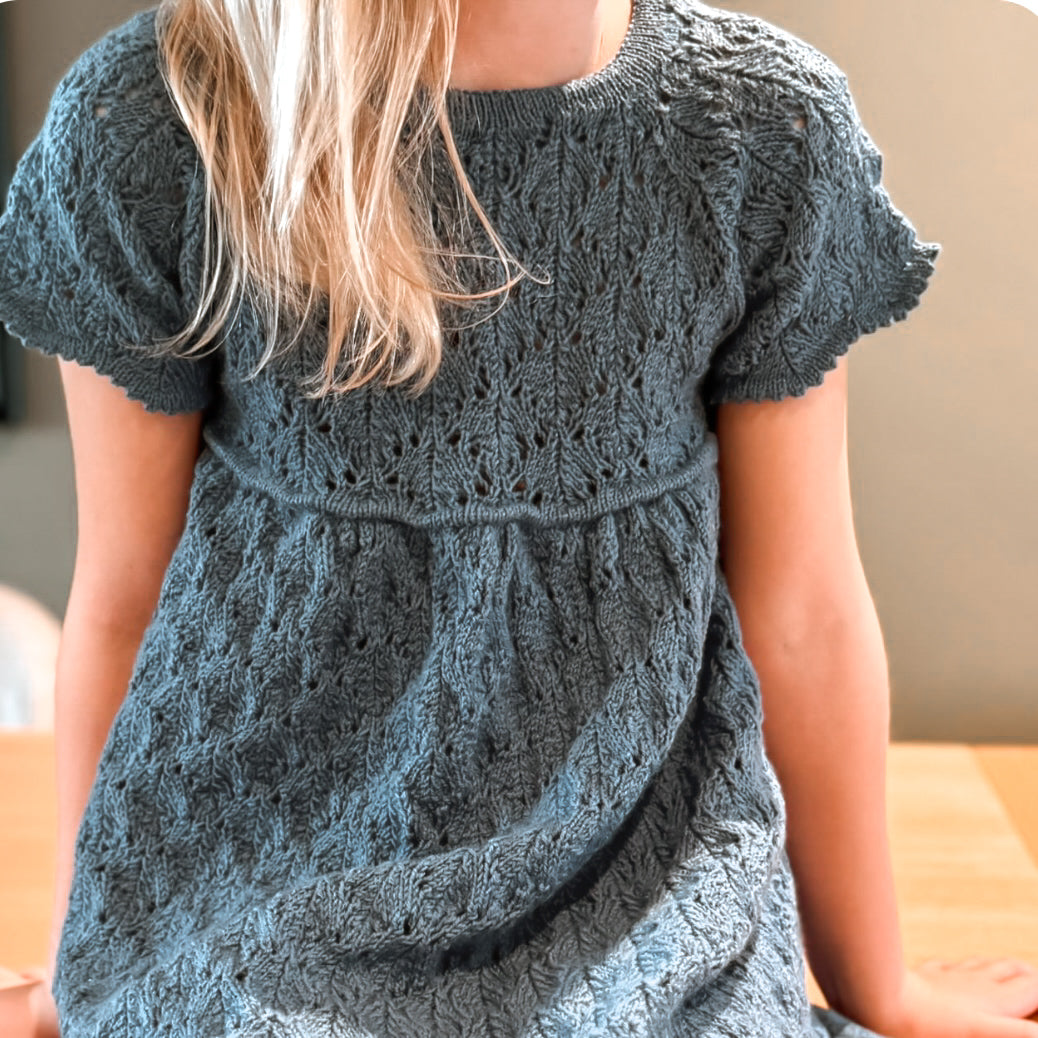 Louise kjole junior strikkes nedenfra og opp og rundt på rundpinne. Hele kjolen strikkes i struktur etter diagram. Kjolen har korte ermer og splitt bak i nakken som lukkes med et sløyfebånd. Det strikkes picot-kanter nederst på skjørtet og på ermene for et enda søtere uttrykk.